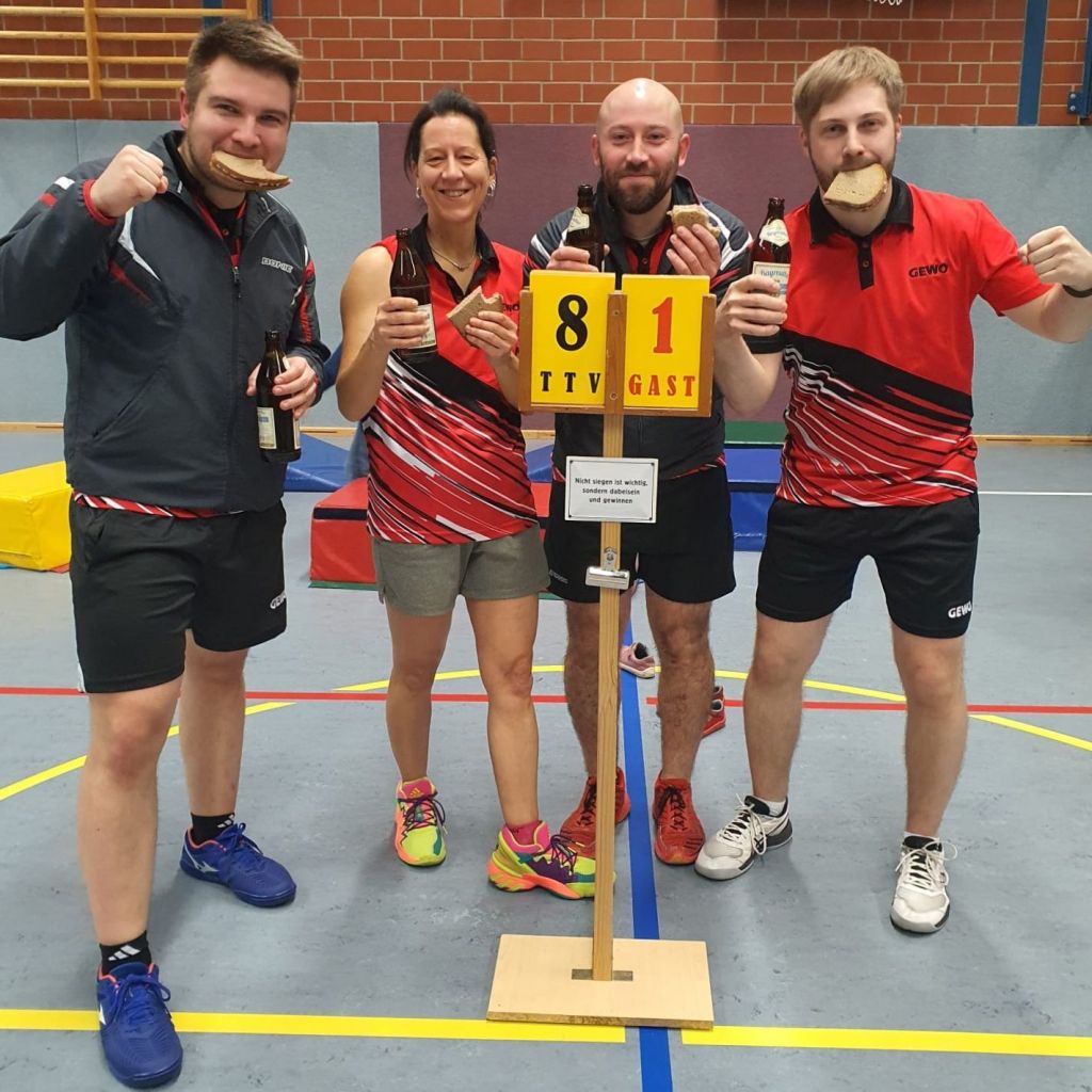 Am Freitagabend war die Mannschaft des TTV 90 Klettenberg in Bestbesetzung angereist, doch was dann passierte konnten die wieder zahlreich erschienen Zuschauer kaum glauben. Zunächst gab es in den Doppelpartien eine Punkteteilung, denn einem 3:0 Sieg von Gessner/Wand stand eine 1:3 Niederlage von Iffland/Stöber gegenüber. In den Einzelspielen folgte dann ein Sieg nach dem anderen durch Andreas Gessner (2), Johannes Wand (2), Katja Iffland (2) und Fabian Stöber (1), so dass am Ende ein 8:1 Sieg auf der Anzeigetafel stand. Dass kein einziges Einzelspiel verloren wurde, hat es für unsere 1. Mannschaft lange nicht gegeben.