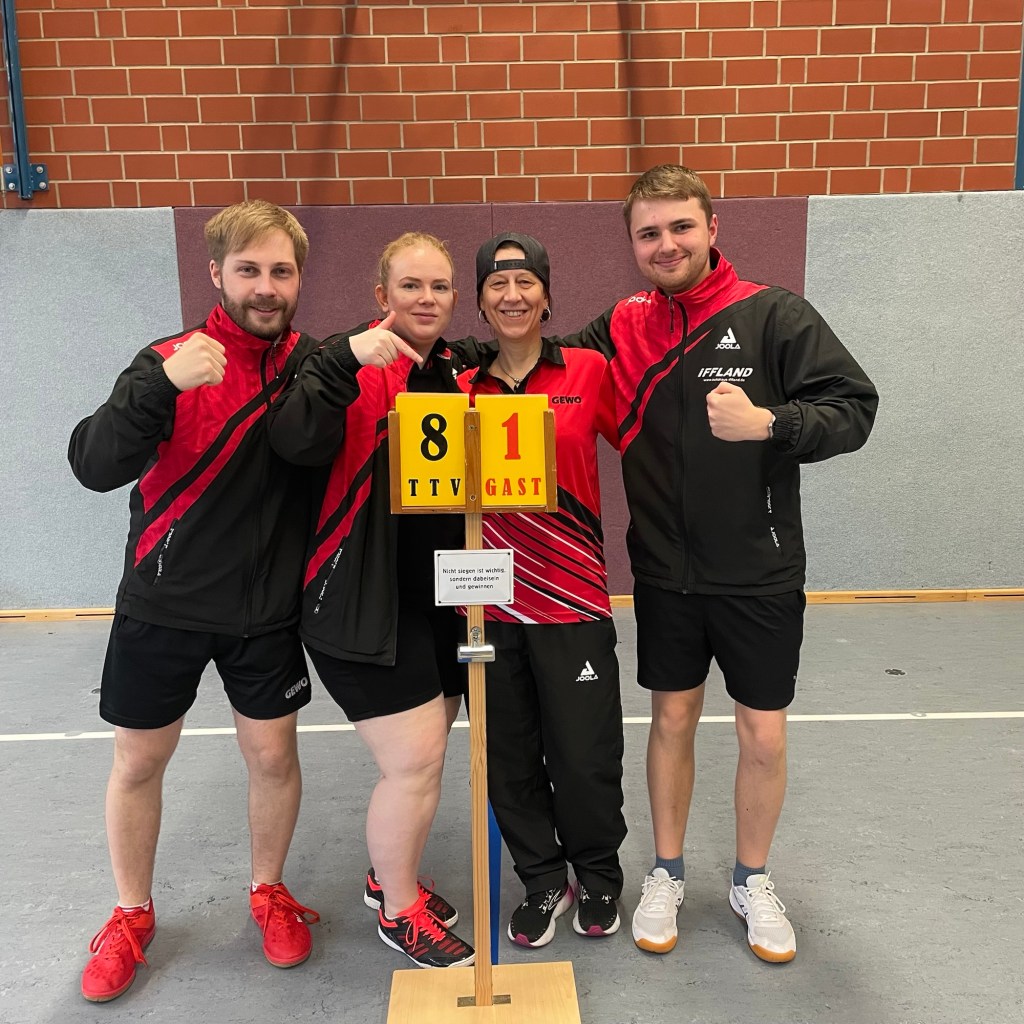 Am Samstagnachmittag empfing unsere Reserve dann die abstiegsbedrohte Mannschaft des Vfl Ellrich. Das Hinspiel endete 7:7, doch die Chance auf Punkte verschlechterte sich für die Gäste, da sie ohne zwei Stammspieler antreten mussten. Folgerichtig stand es nach den Doppeln und der ersten Einzelrunde 5:1, denn nur Fabian Stöber musste sich, nach hartem Kampf, mit 10:12 im Entscheidungssatz gegen Ellrichs Nummer Eins geschlagen geben. Die nächsten drei Einzel wurden siegreich gestaltet, sodass der ungefährdete 8:1 Heimsieg gefeiert werden konnte. Besonders erfreulich war der erste Bezirksliga-Einzelsieg von Jonas Hackel aus unserer vierten Mannschaft, der eine starke, konzentrierte Leistung ablieferte und dafür belohnt wurde! 👏